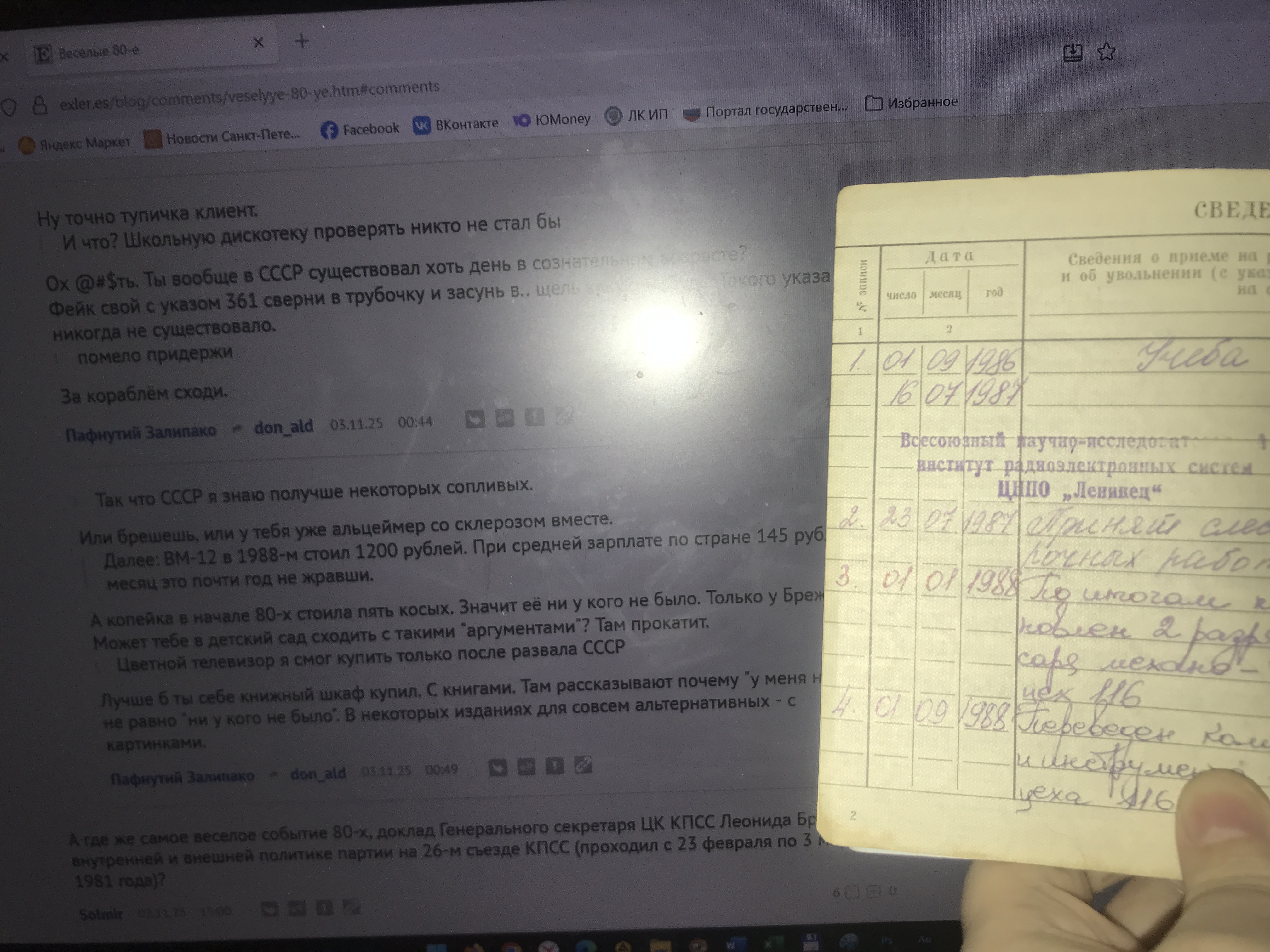Если кого там и не было, то тебя. А за меня моя трудовая книжка говорит. В 1986-м поступил в ПТУ, в 1987-м принят на работу в ЦНПО "Ленинец". Страница на картинке. Так что за кораблём можешь сам плыть, потому что такое вещество, как ты, только плавает.