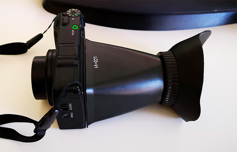 Оказывается, есть и такие. И для всяких солнечных краев - штука очень актуальная, потому что на ярком солнце довольно трудно четко выставить кадр по дисплею. Работает очень просто: вокруг дисплея фотоаппарата на ленте 3M клеится магнитная рамка, а к ней прикладывается вот эта штука, которая примагничивается к рамке. Ставится и снимается она мгновенно, съемке при ярком солнце очень помогает.