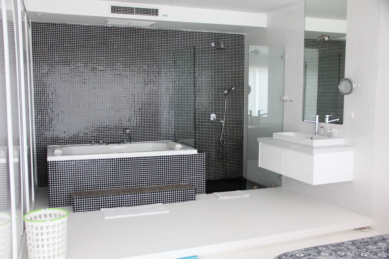 Если повернуться к кровати спиной, увидите ванну и душ, которые вольготно размещены вот так.