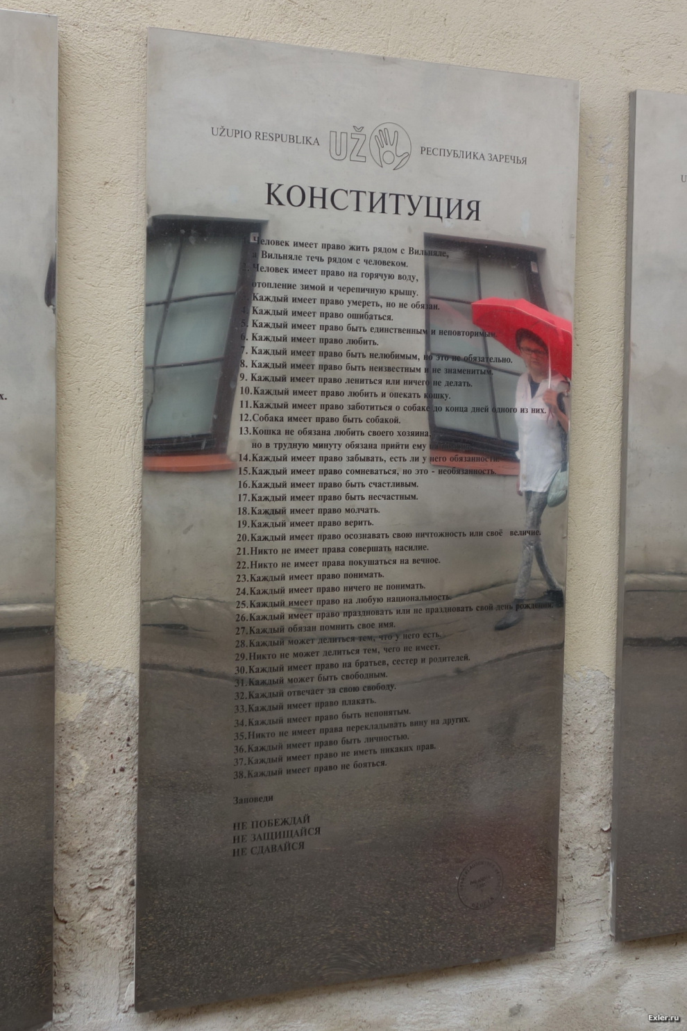 Теперь о том, что это такое. Ужупис (Заречье) - это самопровозглашенная "республика", нечто вроде Христиании в Копенгагене. У Ужуписа есть свой гимн, конституция, президент, епископ, два костёла, бернардинское кладбище, семь мостов и покровитель – бронзовый Ангел Заречья. Конституция республики Ужупис вывешена в начале улицы Паупе - мы ее еще прочитаем.