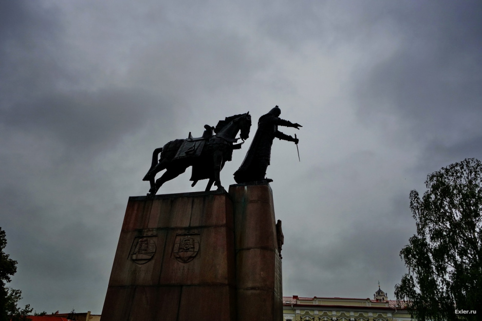 Памятник Великому князю литовскому Гедиминасу. Неподготовленному зрителю кажется, что князь блуждает в потемках и вот-вот упадет с обрыва вместе со своим верным конем князя Игоря, однако это вовсе не так: князь твердо балансирует на вершине, а легенда гласит, что если мимо него пройдет студентка-девственница, то меч в руке князя приподнимется (простое приветствие, ничего более). Но наверняка это просто красивые легенды, как и студентки-девственницы.