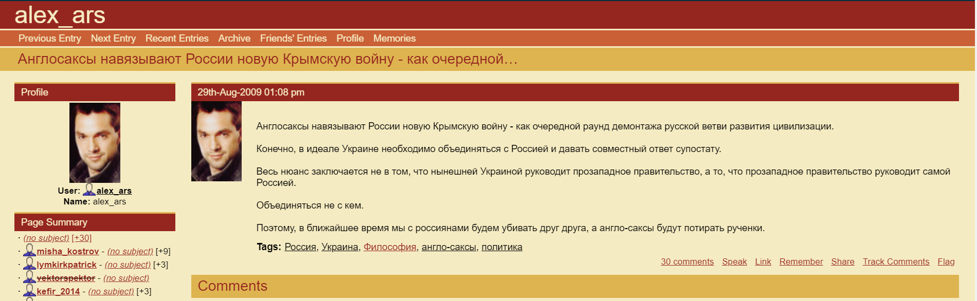 А вот пост Васи Ложкина за 2009 год: "Вот так вот, скажем в 2014 году, пока все украинцы спали, раздался вой сирен и гул самолётов. И на танках, и на конях, и пешком российские войска пересекли границу в четыре утра, чтоб Крым отхапать и Донбасс, чтоб доказать, что голодомора не было, и чтоб сапогом российским топтать демократию и свободу. Ну и, конечно ввергнуть народы в пучину кровавого безумия...".