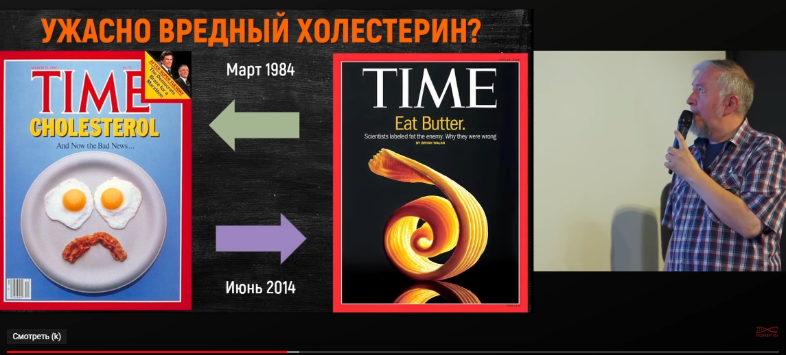 Конкретно по нашей теме, это часть о холестерине и жире, которые еще совсем недавно считались жутко вредными для здоровья. И только буквально в последние 10 лет холестерин и жиры были реабилитированы