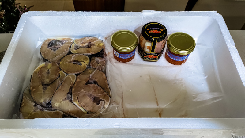 от осетровой фермы "Esturion de sarrion": стейки из осетра, красная икра и банка крабовых ножек