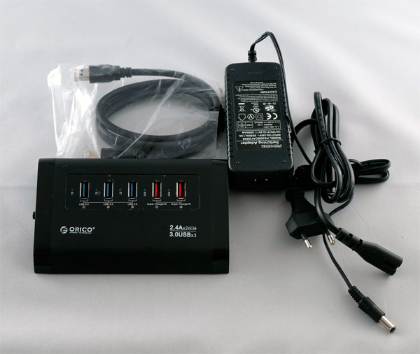 Второе устройство, которое сразу же пошло в дело - Orico UH3C2. Это концентратор USB 3.0 (3 порта) и еще два порта для интеллектуальной зарядки.