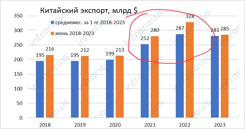 В июне китайский экспорт в долларовом выражении составил 285,32 млрд долларов США – это примерно на 12,5% меньше, чем годом ранее. Как отметили большинство международных СМИ, это падение стало самым сильным за период с февраля 2020 года, т.е. с начала пандемии.
