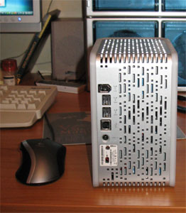 Внешне устройство напоминает толстую книжку, поставленную на попа. Корпус довольно стильный и продуманный - обклеен резинкой, чтобы шум от кулера меньше передавался на стол (или куда его там поставят).
