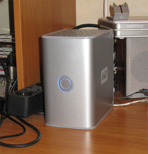 Но просто дешевую внешнюю коробку для трехдюймового винта покупать не хотелось - там и охлаждение не фонтан, и сервисов никаких нет. Вспомнил обсуждение в комментариях к одной из записей в этом блоге, порылся в Сети и в результате заказал вот такую штуку - WD My Book Pro Edition II. Это внешняя бандура, в которой установлены два 500-гиговых винта. Вы можете использовать весь терабайт, а можете для надежности использовать винты в RAID 1 - то есть зеркалить 500 гигов. Она поддерживает три интерфейса: USB 2.0, Firewire 1394a и 1394b.
