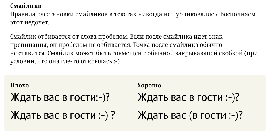 (За исключением закрывающей скобки, с которой смайлик действительно может совмещаться, тут всё верно! 😄