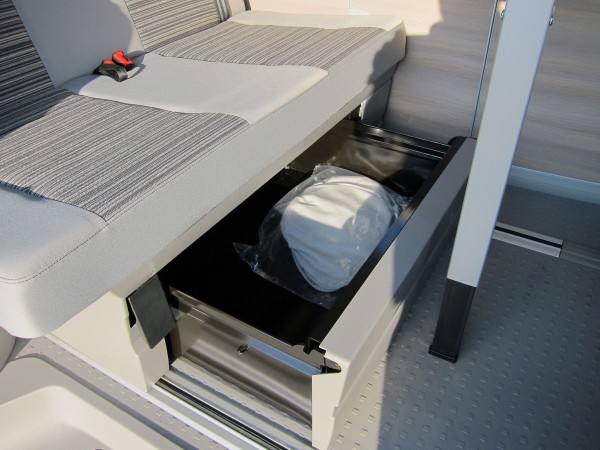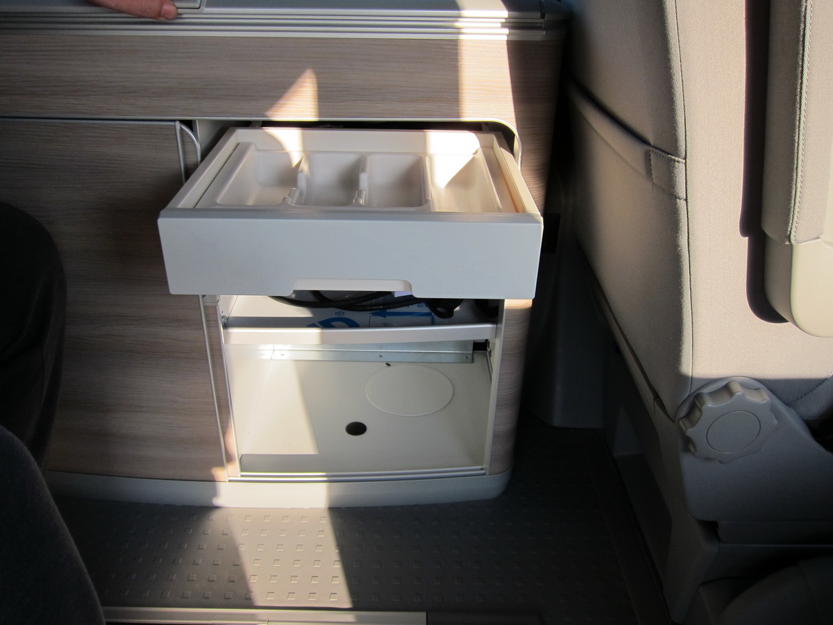 Под задними креслами - большой выдвижной ящик со всякими приспособлениями.