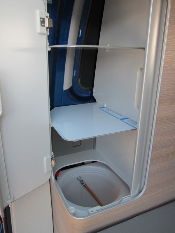 Слева - шкафчик для всяких предметов плюс емкость, куда ставится стандартный пятилитровый газовый баллон.