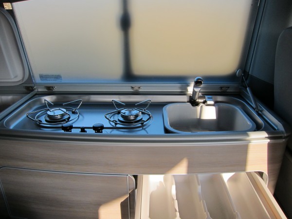 Под правой крышкой обнаруживается рукомойник и газовая плита на две конфорки.