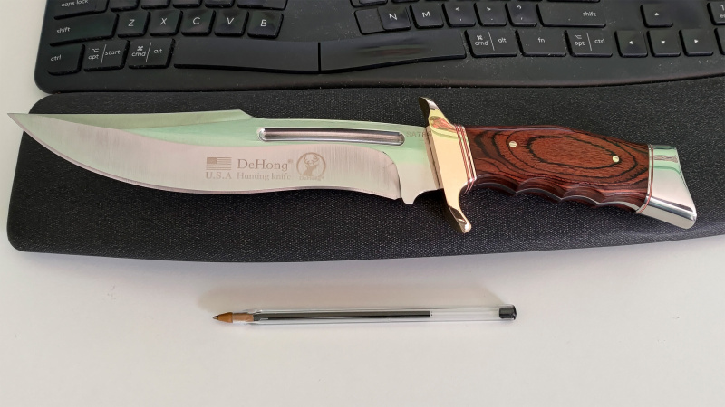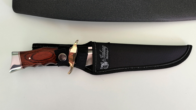 Заточен прекрасно, бумагу режет как масло. Тяжелый, увесистый (ручка тяжелее лезвия, но он, понятное дело, не для метания), качество изготовления и материалы - очень пристойные. Вот матерчатый чехол у него выглядит так себе, но тут, что называется, "шо ви хотите за такие деньги". Я вообще удивляюсь, как китайцы такие штуки продают буквально за копейки - он на Ali стоит всего 1800 рублей, то есть жалкие €20. В магазине с китайскими же ножами в нашем городке этот нож продают за €74 - собственно, я его в магазине увидел, после чего пошел искать на Ali. Всего €20 и доставка с испанского склада - за три дня привезли.