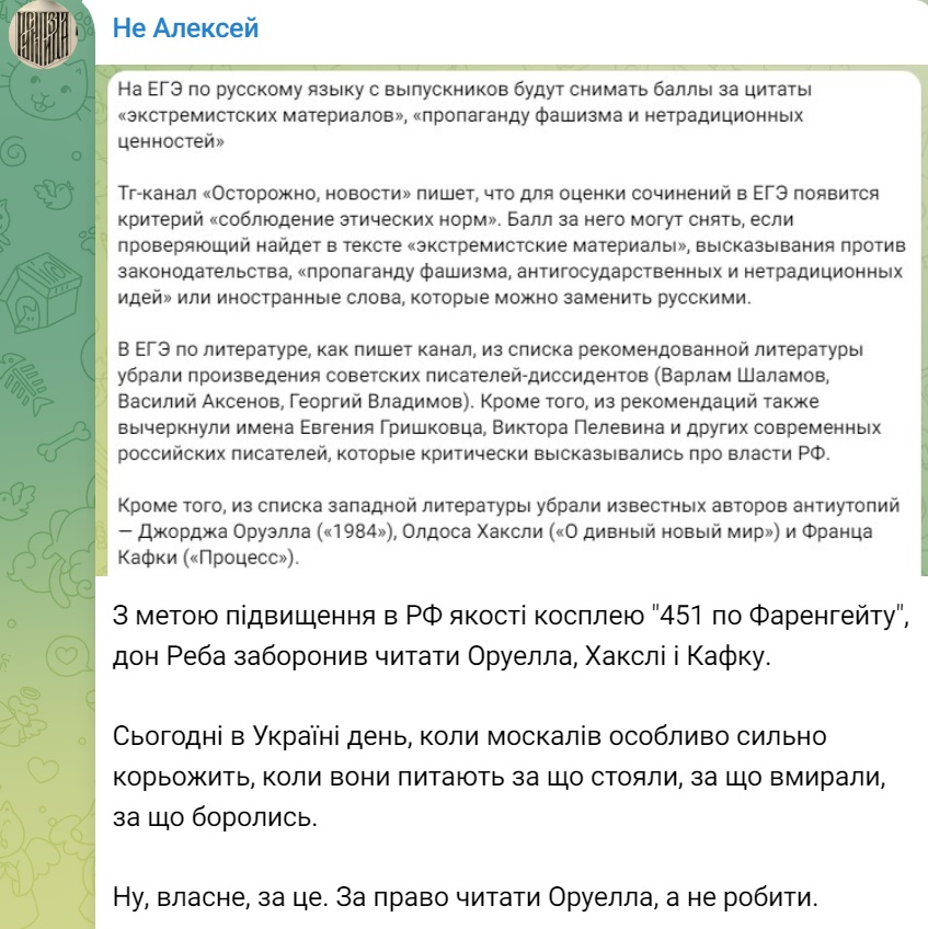 В целях повышения в РФ качества косплей "451 по Фаренгейту", дон Реба запретил читать Оруэлла, Хаксли и Кафку.