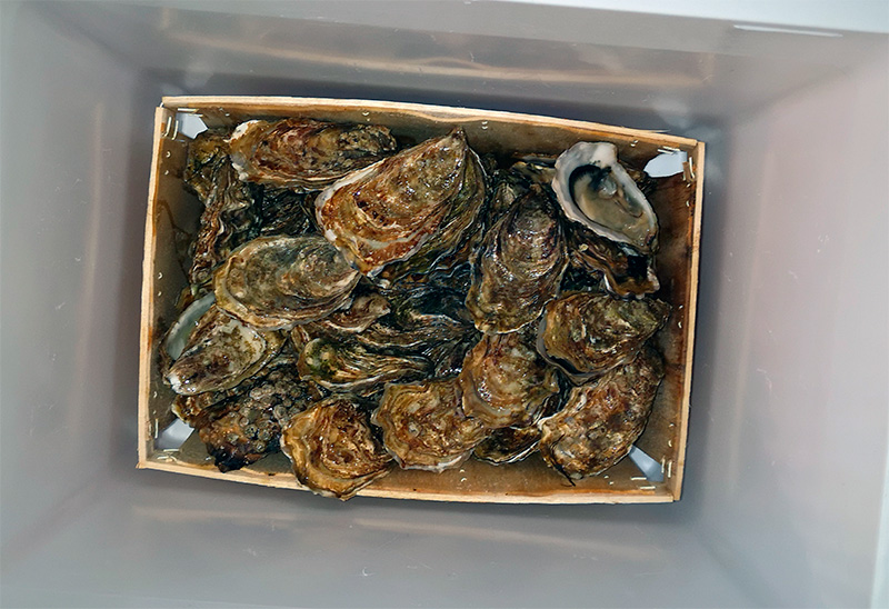 Стояли, стояли, достоялись. Обслуживал нас парень, которого я тут раньше не видел. Нас шесть человек, включая детей, поэтому берем пять дюжин. В ящике - четыре дюжины, пятую дали с витрины, этот вид устриц уже заканчивается. Ящик мы не открывали, я там часто беру ящиками, никогда никаких проблем.