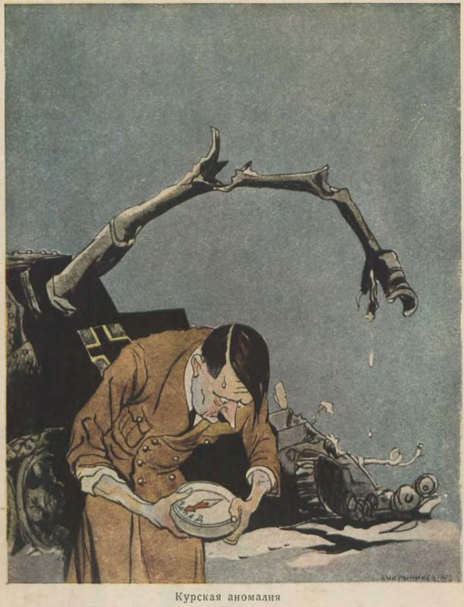 "На одной из военных карикатур Кукрыниксов Гитлер с изумлением смотрит на компас, который вместо севера показывает запад — обыгрывалось поражение немцев на Курской дуге и Курская магнитная аномалия"
