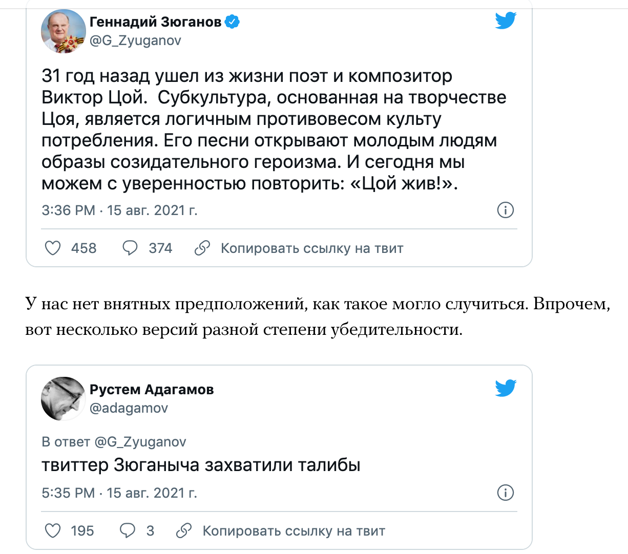 Кстати, не исключаю что талибы теперь станут самыми большими друзьями путинского режима, даже большими чем турецкий и венесуэльский, где то на уровне сирийского. Режимы то схожие, немного разные идеологии, но в целом все то же -- тоталитарная, мракобесная власть и дремучие, запуганные холопы. Ну и враги Америки -- а значит родные брателловы же! Неслучайно путинские уже начали подлизывать талибам.