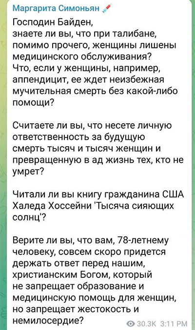 Так вот, оказывается, кто виноват-то с Афганистаном! Симоньянша раскрыла всем глаза. Байден, оказывается, виноват. Не захотел, понимаешь, дальше затыкать этот афганский гнойник жизнями американских солдат, как они это делали два десятка лет. Ну, ничего, ничего, Байден еще ответит перед симоньянским христианским богом.