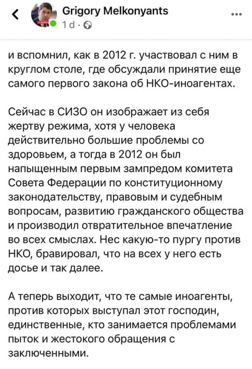 Причем это тот самый Шпигель, который активно поддерживал нынешний правовой беспредел, уничтожение НКО и так далее. А когда его самого этот беспредел коснулся, то только представители НКО им и занимаются. Все эти бравые ребята, поддерживая и одобряя беспредел, почему-то думают: "Уж меня-то это не коснется". Но они ошибаются. Беспредела он, понимаешь, не ожидал. Прям "а нас-то за что"?