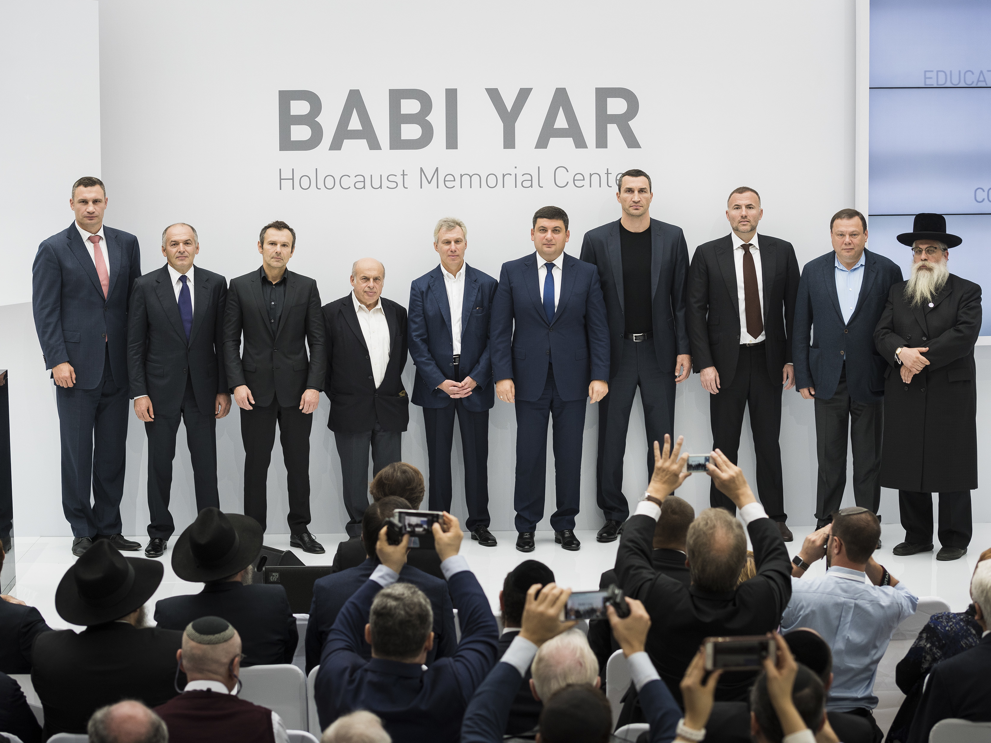 Российские олигархи Михаил Фридман (второй справа) и Герман Хан (в центре) на церемонии поминовения в Бабьем Яру в Украине в 2016 году.