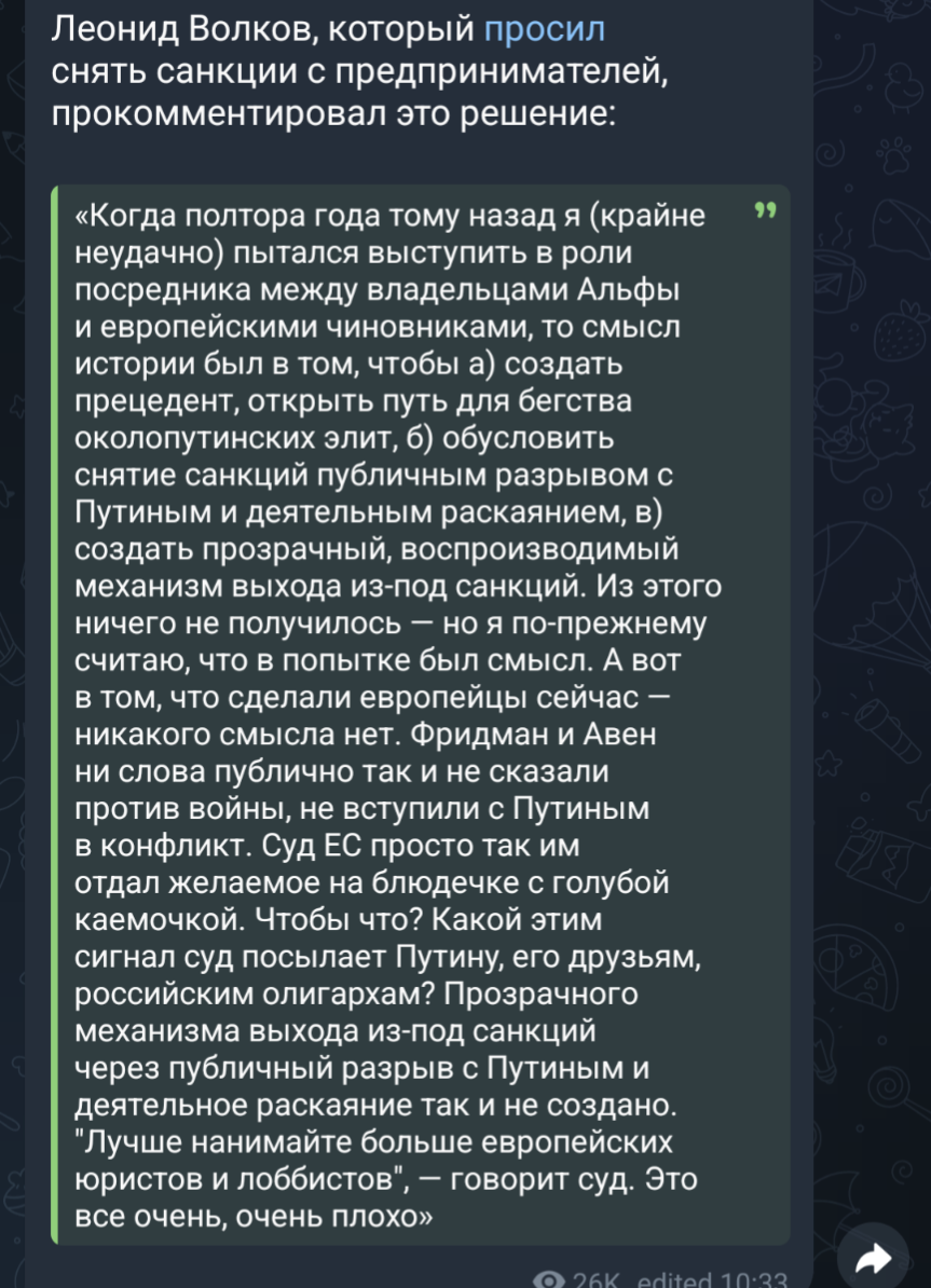 По поводу же данного решения... Оно, конечно, вызывает определенное удивление, однако европейский суд - это европейский суд. Он действует в рамках законодательства, а там не предусмотрено формулировок из серии "Мы знаем, что Фридман и Авен поддерживают войну и причастны к финансированию войны". Суд рассматривает доказательства. Доказательства есть - иск не удовлетворяется. Доказательств нет - иск удовлетворяется.