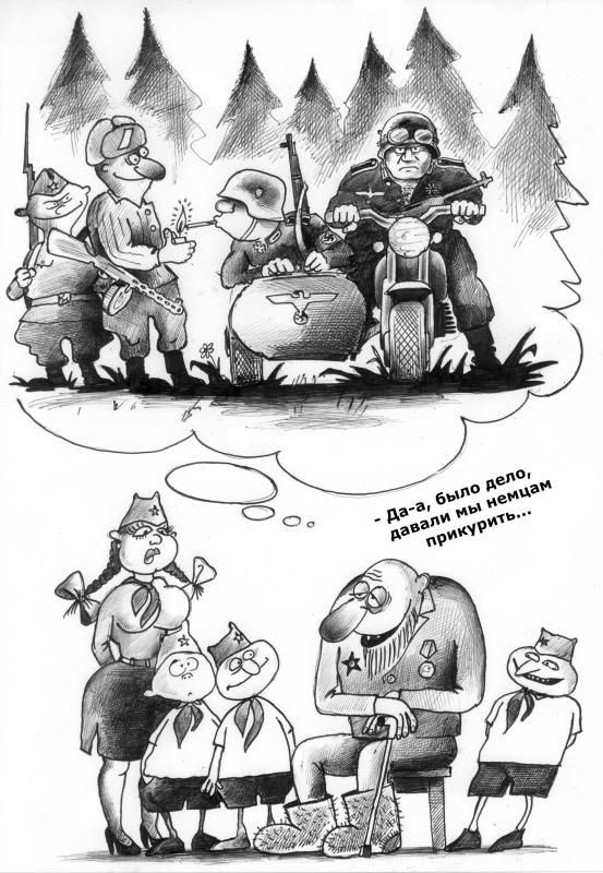 А внучку просто пох и на деда, и на все его страдания. Внучку хоть как-то пайку отрабатывать надо, да прямо сейчас – это ж точно важнее какого-то там непонятного, да ещё и уже мёртвого деда (который даже возразить ничего не может). Зато на ближайшем "девятимайск-пати" – внучок таки гордо выпрется с портретом этого самого деда на палке.
