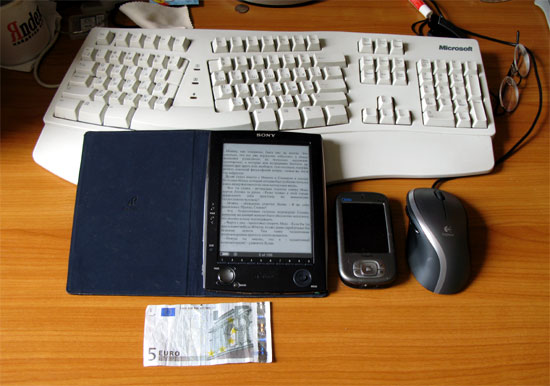 Приобрел наконец-то Sony Book Reader (писал о нем здесь). Вот она, эта прелес-с-с-с-сть... (Остальные предметы приведены для сравнения масштабов.)