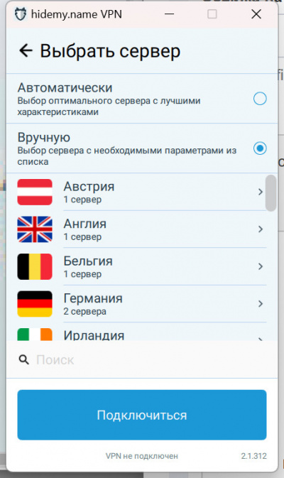 Чтобы выбрать сервер в конкретной стране (также часто в одной стране можно выбрать из нескольких серверов), достаточно нажать стрелку в строчке "Сервер", после чего из списка выбрать нужную страну и нажать кнопку "Подключиться". Вот и всё!
