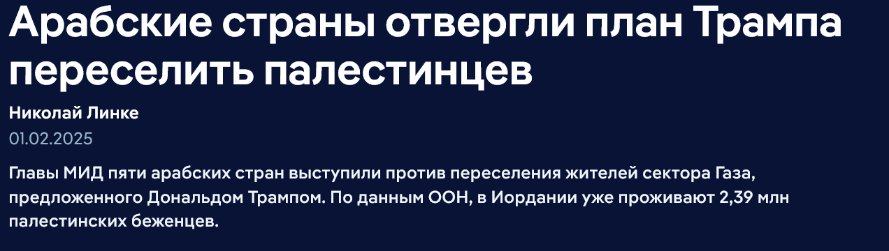 «Газа — не место для жизни людей, и единственная причина, по которой они хотят вернуться, и я твердо верю в это, заключается в том, что у них нет альтернативы», — сказал Трамп перед началом переговоров с Нетаниягу. Палестинцам, по его мнению, вместо Газы нужно предоставить «хороший, новый, красивый участок земли» для жизни.