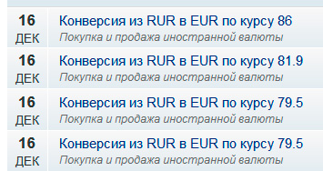 Я, собственно, к тому, что вчера немножко развлекался (когда понял, что не надо ждать милостей от природы): переводил на основной оперативный счет остатки рублей и конвертировал их в евро. Остатки приходили неравномерно и выглядело это очень даже забавно. Вот выписка из вчерашней истории (снизу вверх).