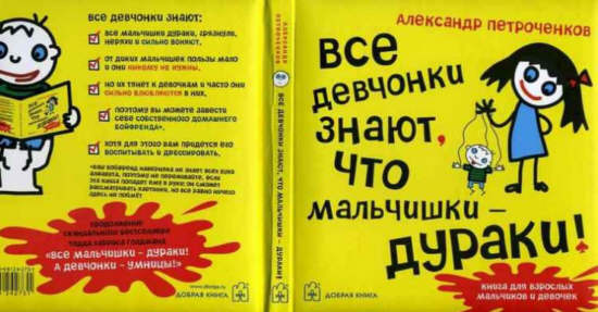 Прислали ссылочку на прелестную книжку Петроченкова "Все девчонки знают, что мальчишки - дураки". Сначала это смотрится как закос под Остера - мол, стебовая детская книжка. Но потом довольно быстро становится понятно, что под псевдонимом Петроченкова скрывается какая-то престарелая девственница-феминистка, которой жуткие комплексы в адрес мужского населения не дают спокойно жить. Вероятно, сначала она пыталась писать книжку для взрослых, где раскрывала глаза на это мужское племя, но издатели (которые почти все - мужского пола) ей это дело заблокировали. Тогда мадам взяла мужской псевдоним и забабахала книжечку якобы для детей. Как это вообще выпустили - непонятно, но издателям за это в любом случае большое спасибо. Автору хотя и хочется посоветовать сделать массаж лица и пообщаться с хорошим психиатром, но за книжку - низкий поклон. Лично я - тащился.