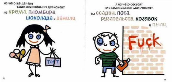 Это не перевод. Это именно плагиат, чутка отличающийся от "Boys Are Stupid, Throw Rocks at Them!". Например, достаточно безграмотно перерисованы картинки ("мальчик" в новом исполнении вообще не попадает в стилистику, в отличие от оригинала); да и тексты стали даже тупее и пошлее чем были. И неясно зачем добавилась изрядная доля совершенно нездоровой злобы.