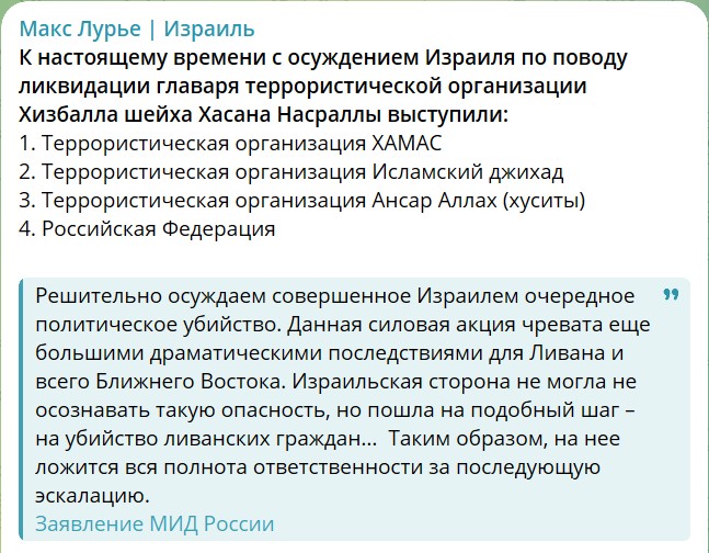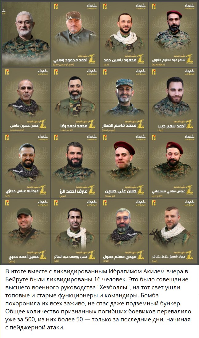 «Действуя по точной разведывательной информации, самолеты ВВС Израиля нанесли удар по центральному штабу "Хезболлы", расположенному под землей, под жилым домом в районе Дахия в Бейруте. Атака произошла в тот момент, когда высшее руководство "Хезболлы" находилось в своей штаб-квартире и занималось координацией террористической деятельности против граждан Государства Израиль», говорится в сообщении. (Отсюда.)