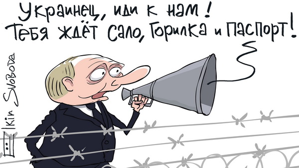 Что вижу на картинке: ВВП призывает украинцев сбежать в РФ из-за колючей проволоки (явный намёк на "стену Яйценюка" и похожие проекты украинской стороны). С обещанием паспортов и более успешной жизни. Какая-то диверсия Ёлкина да еще и за деньги американских налогоплательщиков ("свобода", как-никак).