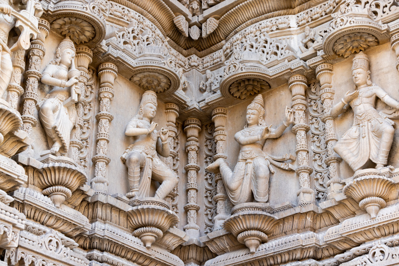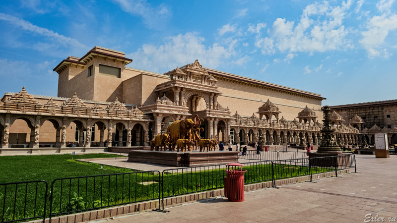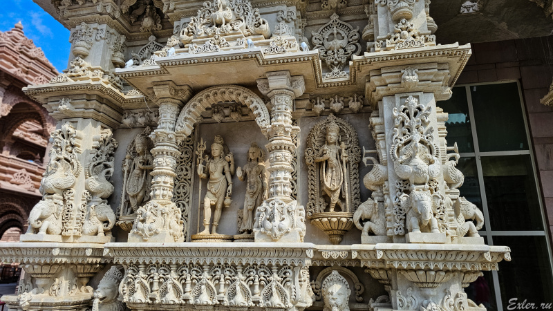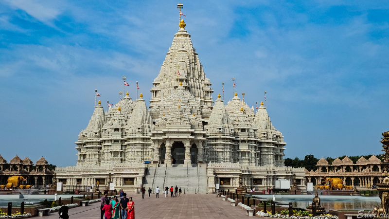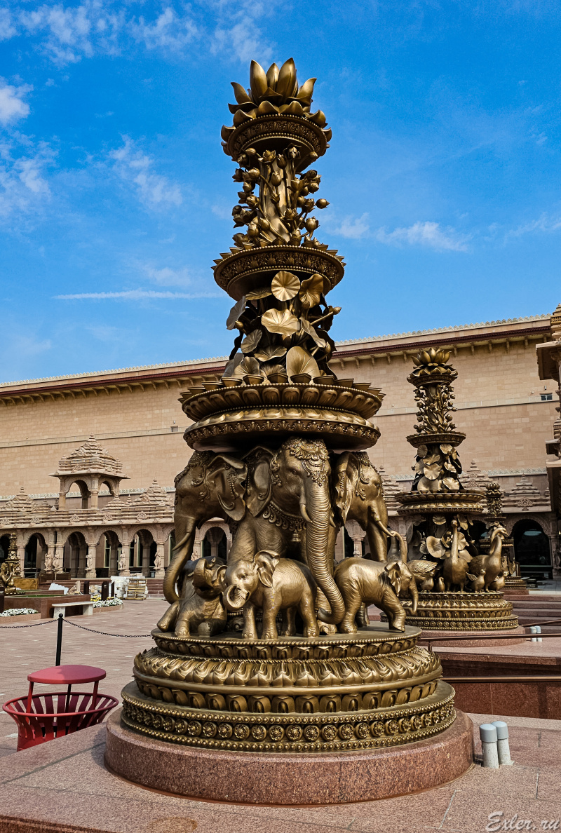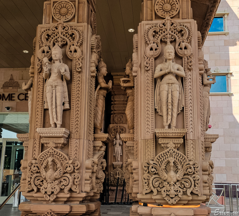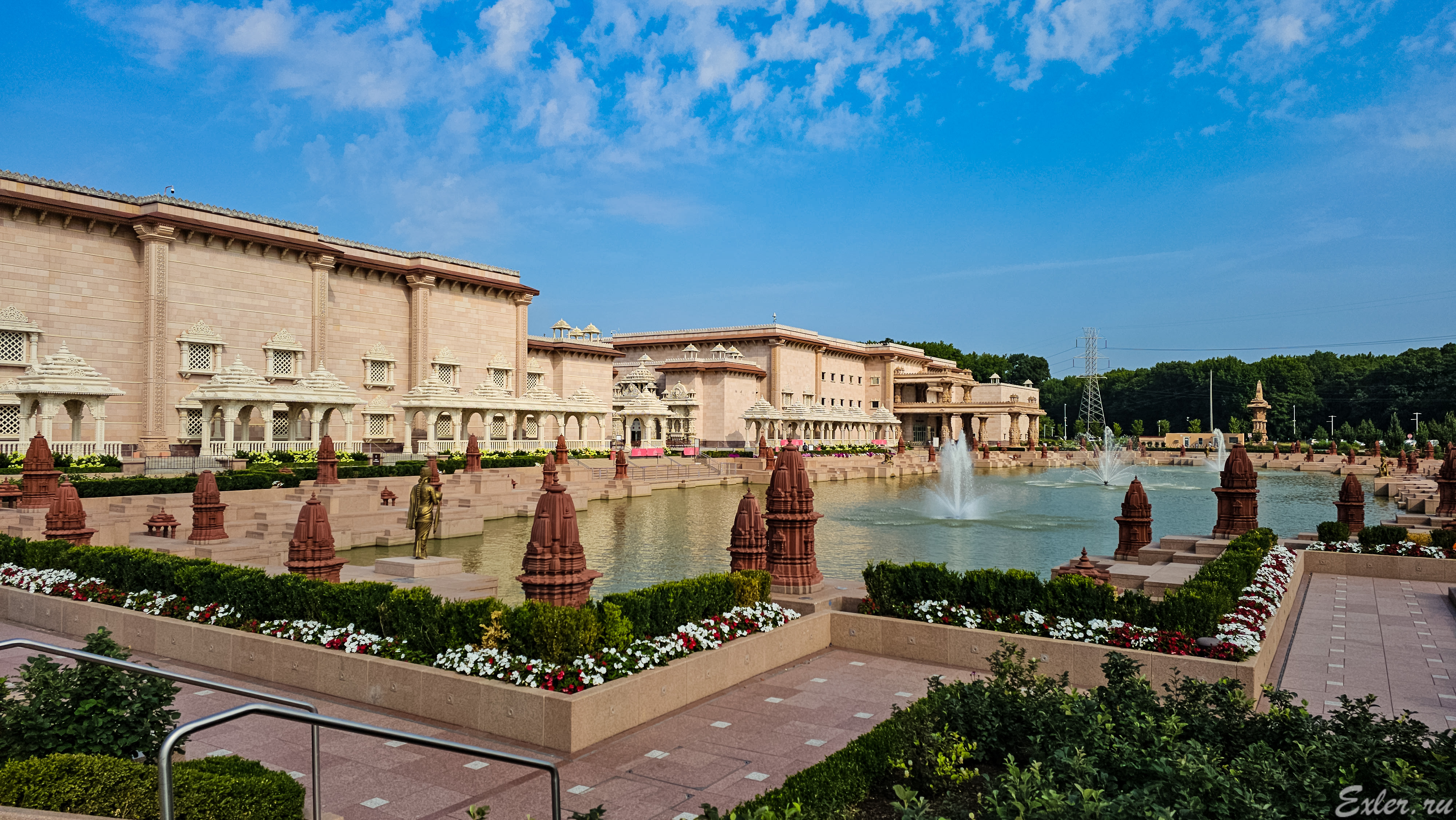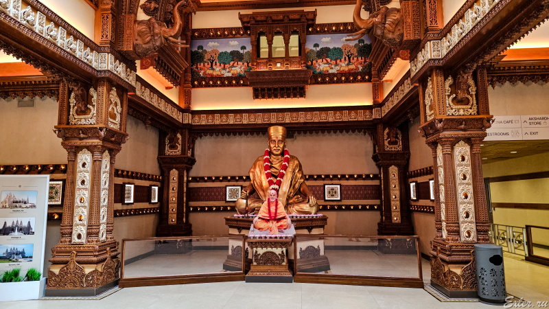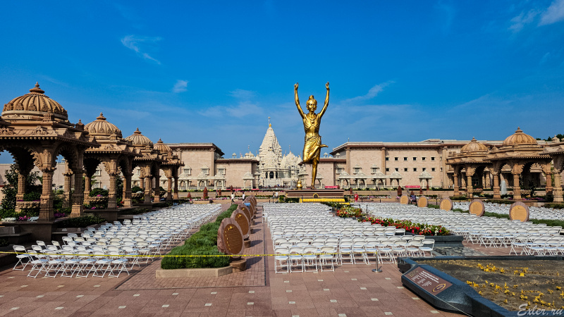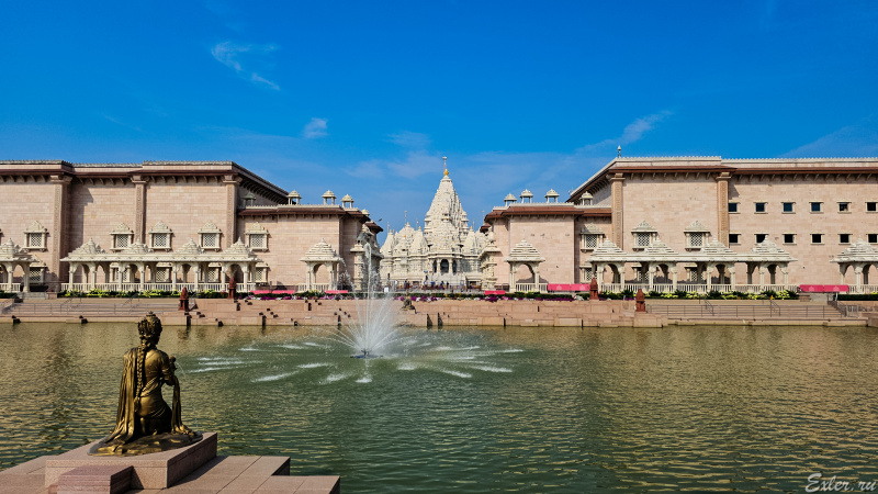 Если подходить к комплексу с лицевой стороны, то прямо на нас смотрит статуя святого Сваминараяна: собственно, храм посвящен этому святому, а строительством храма занималась организация BAPS (Бочасанваси Шри Акшаром Пурушоттам Сваминараян Санстха) - крупнейшая религиозная и гражданская организация, действующая в рамках сообщества Сваминараян.