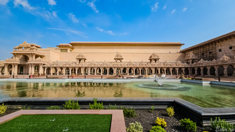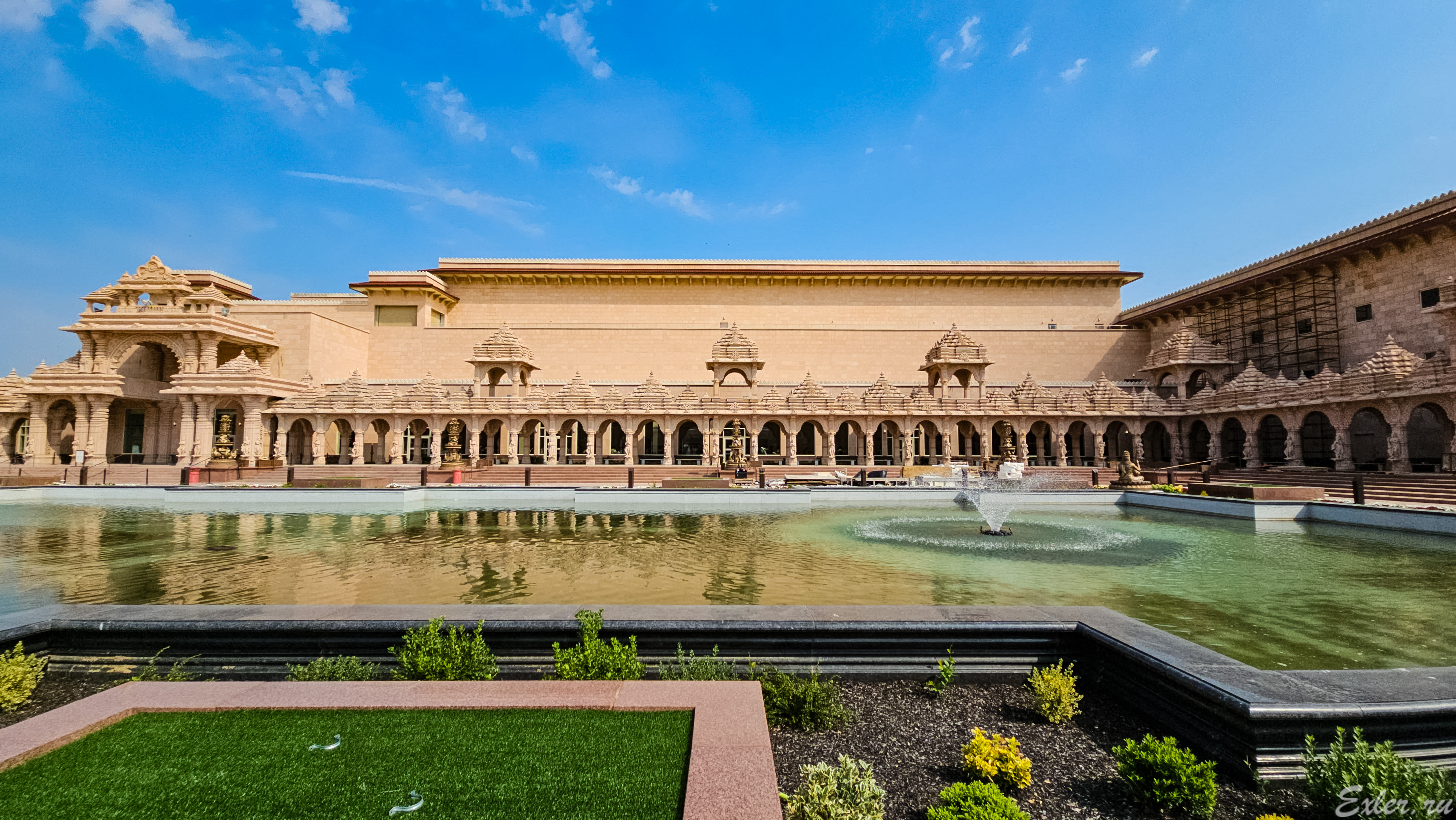 Вид на храм со стороны водоема. По краям водоема стоят четыре статуи, символизирующие четыре святых реки Индии: Ганг, Ямун, Сарасвати и Сарью.