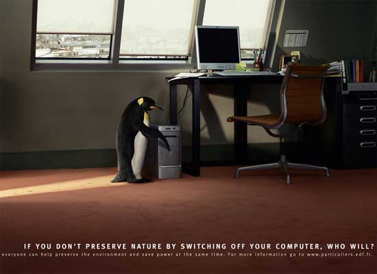 Вообще то непонятно почему плакат призывающий сделать что то хорошее для природы и будущих поколений добровольно(не ездить на машине, а пользоваться велосипедом когда возможно, экономить электричество или воду, сдавать макулатуру для переработки, экономней расходовать отопление в квартире, есть вегитаранскую пищу или хотя бы мясо только тех животных чьи права были защищены от жестокого обращения-т.е. они были забиты безболезненно а жили в комфорте) вызывает желание оправдаться. Насильно же никто не призывает выключать компьютеры в приказном порядке? Видно, pаз народ начал дружно оправдываться какую то спящую струнку совести пингвин задел, жалко стало беднягу жизни которого угрожает ваш включенный компьютер(так как он сжигая энергию и нагреваясь спосoбстует глобальномy потеплению и может даже разрушению озонового слоя).