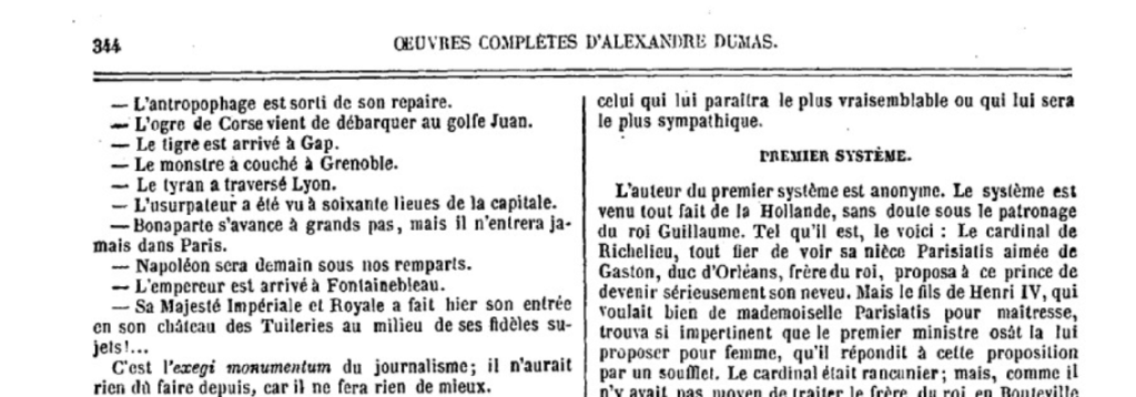 Ну, это классика. Из книги Тарле "Наполеон", где приводились заголовки одной и той же парижской газеты во время 100 дней. С эпитетами в адрес НБ: от корсиканского чудовища до Его Императорского Величества.