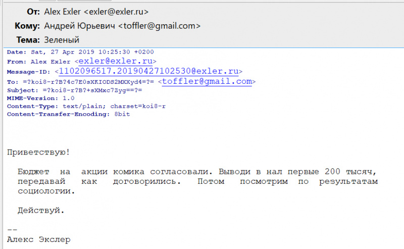В ответ на это Андрей Юрьевич пишет письмо на адрес штаба Зеленского в городе Николаеве  (mykolaiv@ze2019.com), где стоят лишь две цифры — 4 и 200. Как можно понять по контексту предыдущего письма, подразумевается, что согласовано 4 транша по 200 тыс.