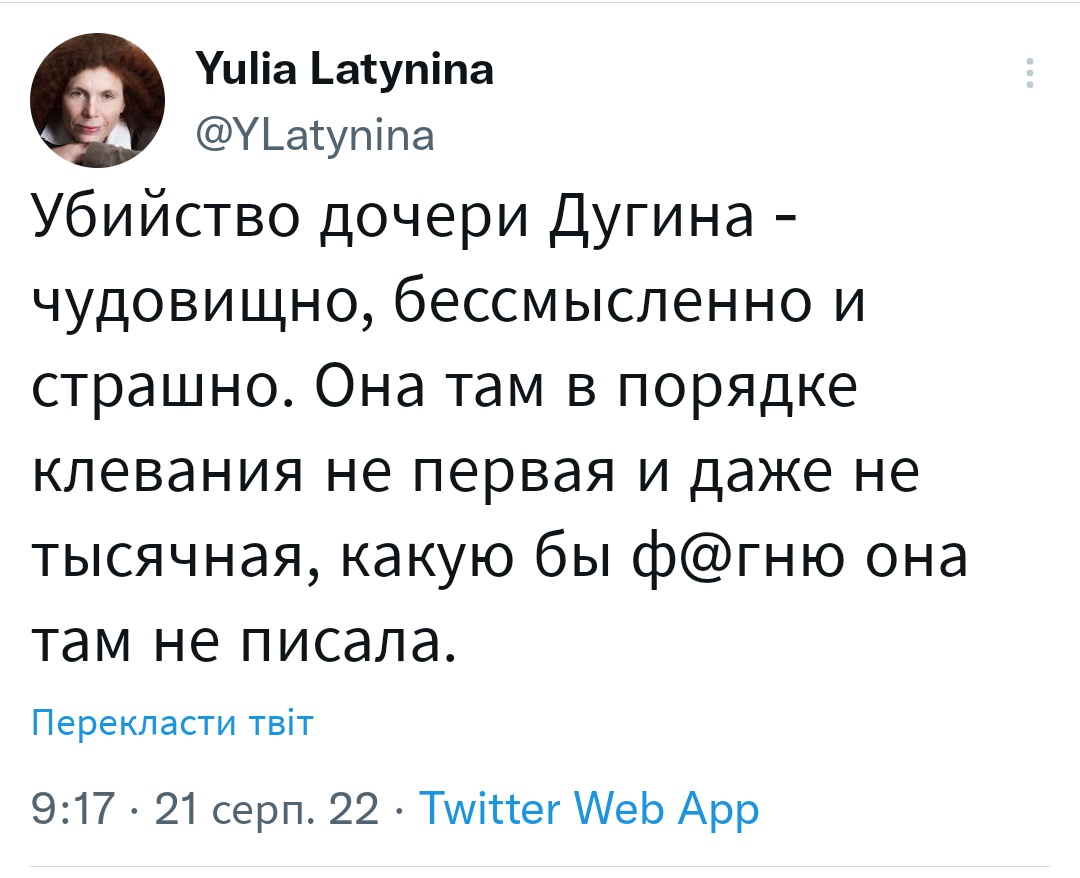Кремлевские геббельсы ежедневно выливают ненавистнической лжи на сотню убийств дочери Дугина, это атом водорода в океане.