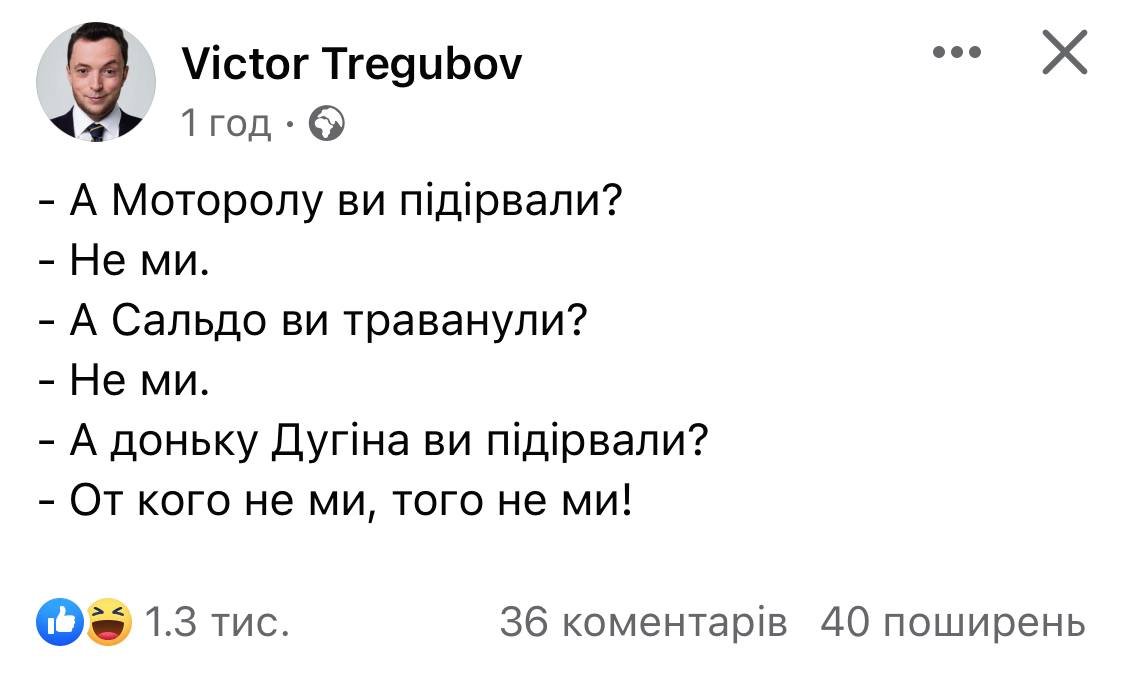 Может он сам ее взорвал ради хайпа. Ходят слухи, что в последнее время дела не очень шли. Наверняка ему нужна была сакральная жертва, наступление стало выдыхаться, эти нацики на что только не готовы - даже родную дочь в жертву принести. А вообще может быть и двигатель просто сам взорвался. Если это иномарка была - они сейчас из такого говна движки делают. Вот у меня в девяностых зубило было - там движок ничем не прошибешь. А сейчас пальцем кузов ткни - дырку проткнешь - качества никакого. Так что все не так однозначно. Слишком много версий произошедшего в медийном поле.