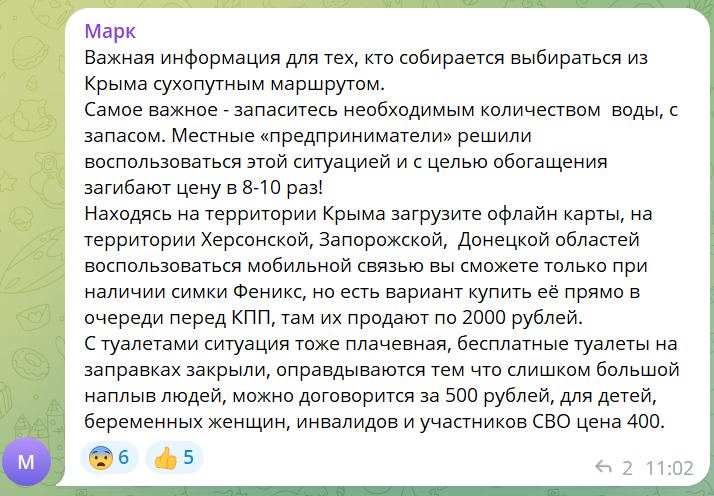 Лохи из МО РФ такой бизнес про...ли- поставили бы у КПП при въезде на "новые территории" вербовочный пункт и всё, подъезжают к КПП тачки с туристами и всех туристов мужского пола вытаскивают из машин и ведут под белы руки прямо в вербовочный пункт, а оттуда прямиком в окопы, как истинные путриоты, отдавать свой "долг перед родиной". Негоже настоящему путриоту в "тяжёлое для страны время" греть брюхо на пляжу.