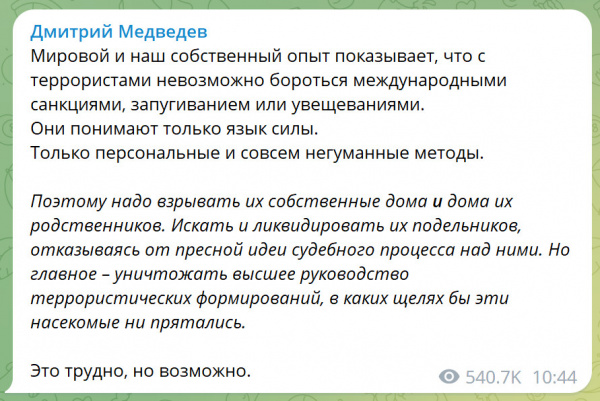 Upd: Ну всё, Димон проснулся, опохмелился, выступил с важным правительственным заявлением. Про Судный день, впрочем, не сказал. Сказал, что против террористов международные санкции и увещевания не действуют. Так мы это и раньше знали на примере РФ.