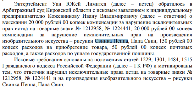 Фееричная история совершенно. Есть такой сверхпопулярный мультфильм "Свинка Пеппа". Всеми правами на персонажей мультфильма обладает компания Энтертеймент Уан ЮКей Лимитед. Некий российский ИП Кожевников И.В. незаконно использовал персонажей из данного мультфильма. Компания обратилась в суд по факту нарушения своих авторских прав.