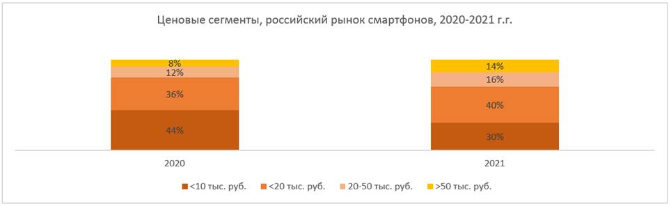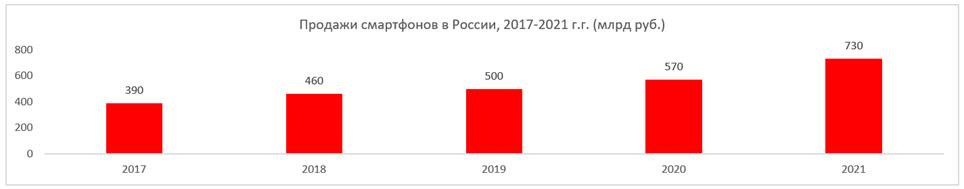 Продажи смартфонов в 2021 году составили более 30 миллионов штук, а объём рынка достиг 730 миллиардов рублей. Ещё был замечен повышенный интерес к устройствам дороже 50 тысяч рублей, продажи которых в количественном выражении выросли на 70%. Их доля достигла в штуках 14%, а в деньгах — 45%.