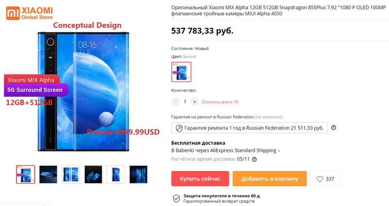 Помните смартфон Xiaomi Mi Mix Alpha, у которого, по мнению журналистов "Ведомостей", экран занимает 180% поверхности? Так вот, он уже в продаже. В официальном магазине.