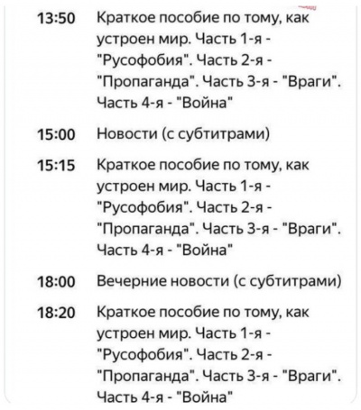 Однако оказалось, что это реальная программа, и что "Первый" все воскресенье показывал пропагандонную поделку "Краткое пособие по тому, как устроен мир".