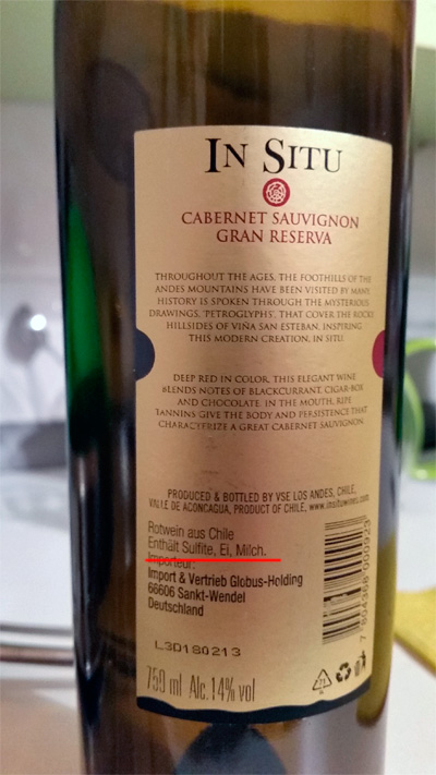 Читатель Всеволод прислал письмо с интересным вопросом. Он купил в Германии бутылку чилийского каберне совиньона, на этикетке которого было предупреждение о том, что вино может содержать сульфиты, яйца и молоко. (Такие надписи делают для аллергиков.)