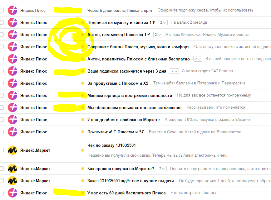 Тоже не подаюсь уговорам. Сегодня в кои-то веки зашел в почту яндекса, и точно такая же картина как у вас: куча писем от яндекс плюс с их рублями, двухрублями))
