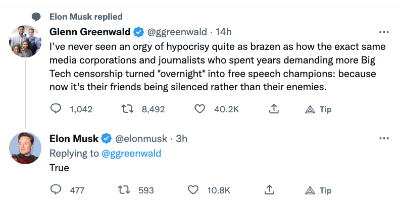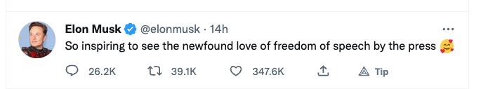 Ну и вслед за эти Маск забанил несколько аккаунтов известных журналистов, которые его критиковали - "Elon Musk bans several prominent journalists from Twitter, calling into question his commitment to free speech". Забанил якобы за то, что они тоже делились его местоположением (чего они, судя по всему, не делали).